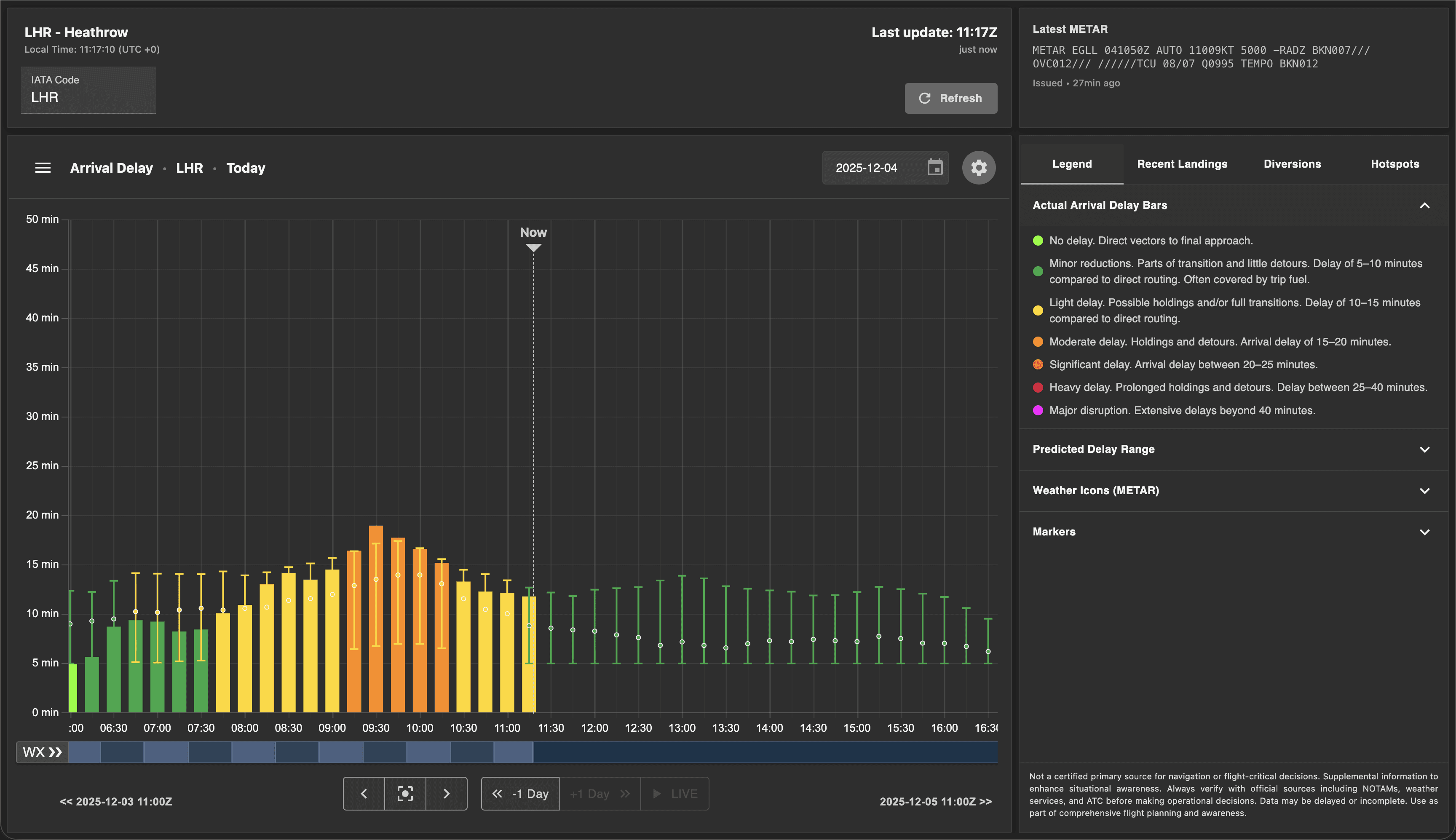 Our database ingests every global METAR and TAF, creating a complete historical and live weather record. By combining flight data with precise weather observations and forecasts, we unlock deeper insights into delays, diversions and arrival flow patterns.