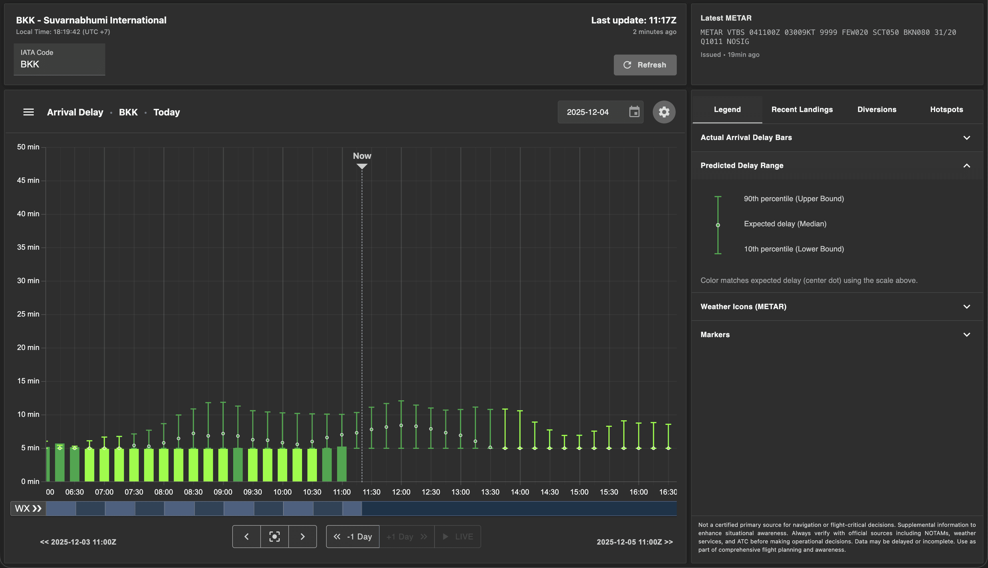 Historical METARs + active TAF overlaid conveniently on flow—see how similar weather affected yesterday’s arrivals.